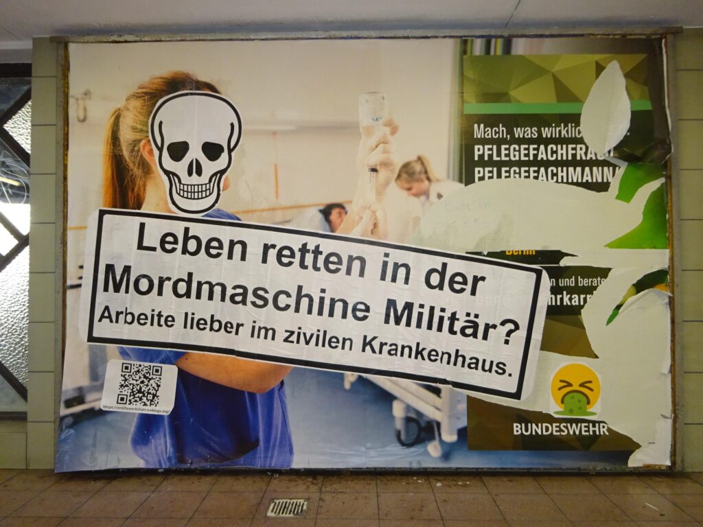 Militär-Werbung im öffentlichen Raum wird immer alltäglicher. Der Kampf gegen die millionenschweren Werbebudgets des Militärs scheint aussichtslos. Doch Werbung im öffentlichen Raum ist besonders gut angreifbar. Kaum jemand mag Werbung, und die zahlreichen Werbeanlagen im öffentlichen Raum lassen sich unmöglich 24/7 bewachen. Hier setzt die antimilitaristische Kommunikations-Guerilla aus der Werkstatt für Antifaschistische Aktionen (w2a) mit Adbusting-Kampagnen an. Werbeplakate können gestohlen, übermalt und überklebt werden, um die Botschaft bis zur Unkenntlichkeit zu verzerren.