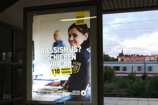 Ein neuer Vorwurf musste her. Die Beamt*innen bemerkten, dass auf einem der Plakatmotive ein Pressefoto der Polizei Sachsen abgebildet war. Darauf zu sehen ist eine Polizist*in, die von ihrem Schreibtisch aus in die Kamera lächelt. Die Gruppe “Gegen deutschnationale Polizeigewalt (GdP)” versah das Plakat mit dem Spruch: “Rassismus? Schieben wir ab!” Das verletze das Recht am eigenen Bild der Polizist*in laut § 22 Kunsturheberrechtsgesetz, fand das LKA 521.