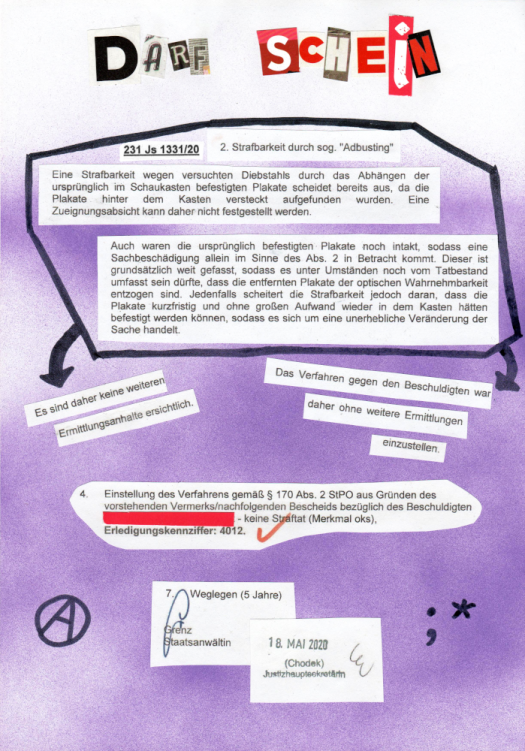 Doch die Cops ermittelten munter weiter. Sie taten einfach so, als hätten sie von der rechtslage keine Ahnung und unterstellten Diebstahl und Sachbeschädigung. Sie nötigten die Firma, auch kleinste vermutlich alte Schäden an Werbevitrinen zu melden. Außerdem wertete die Bundespolizei mit mindestens zwei Beamt*innen neun Monate lang Aufzeichnungen von Videokameras an den von der Aktion betroffenen Bahnhöfen aus. „Ich würde mich freuen, wenn die mein nächstes geklautes Fahrrad auch so engagiert suchen…“ sagt Kai N. Krieger. „Vielleicht sollte ich Sprüche zu Polizeigewalt und Rassismus drauf schreiben, damit es die Cops interessiert?“