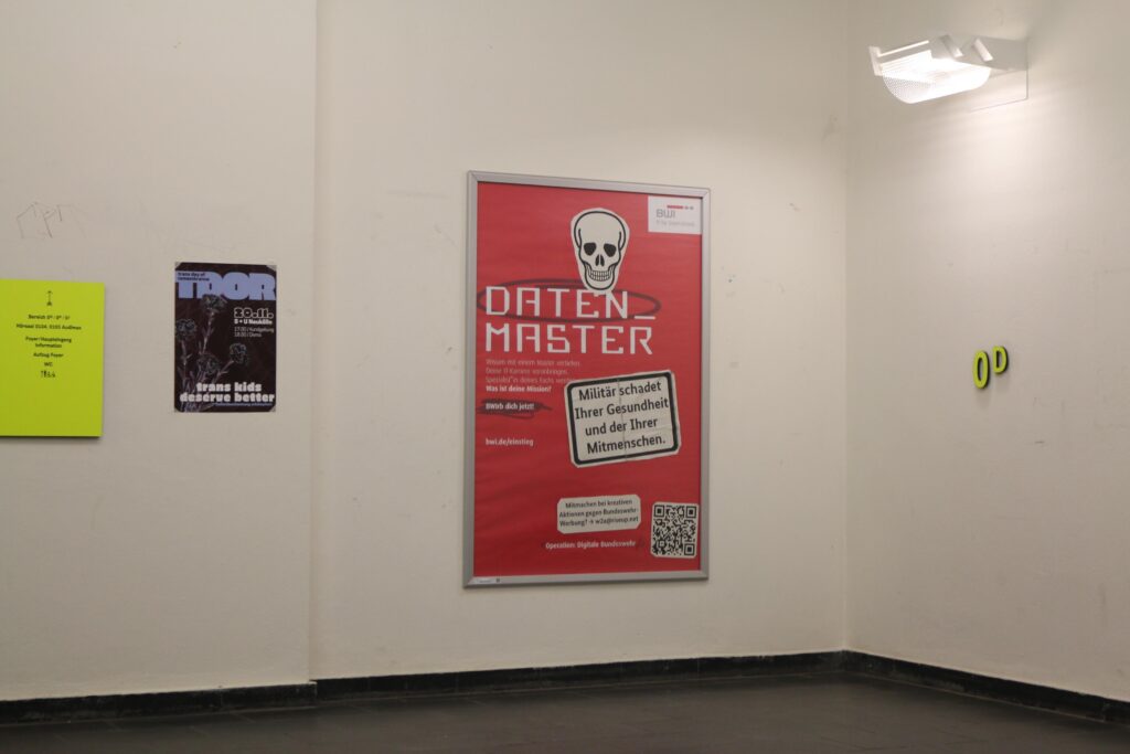 Die Aktiven der Werkstatt für Antifaschistische Aktionen (w2a) korrigierten alle Militär-Plakate im Hauptgebäude, der Chemie, der Hauptmennsa und dem EB. „Wenn ihr in weiteren Gebäuden auch Militär-Plakate seht, kümmert euch bitte drum!“ appeliert Kai N. Krieger. Die Plakate befinden sich in Klapprahmen. Diese lassen sich mit bloßen Händen öffnen. „Schickt uns gerne Fotos von euren Aktionen an w2a@riseup.net!“