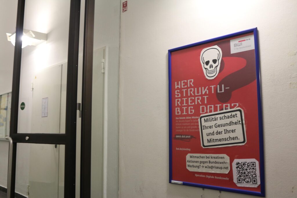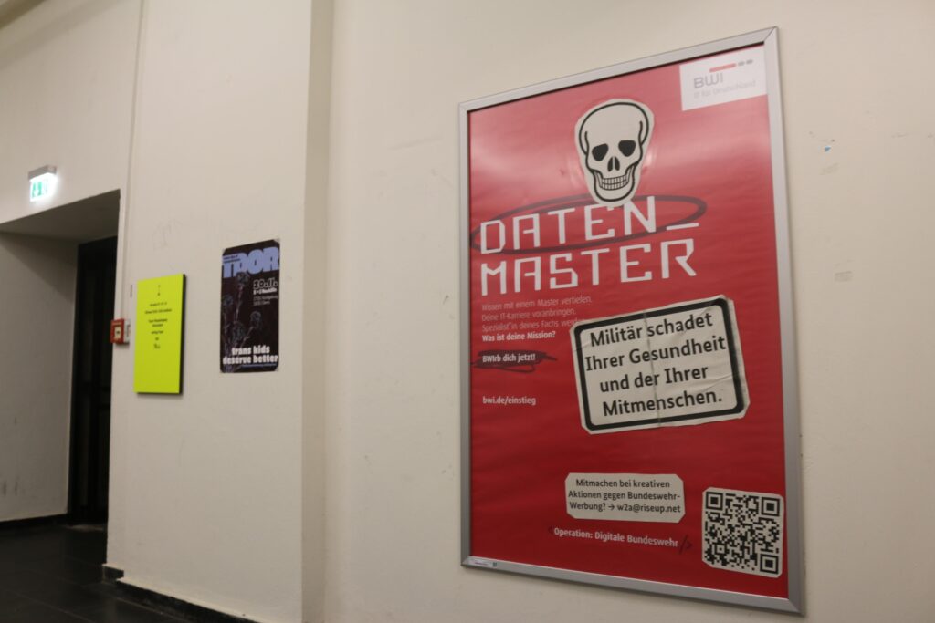 Ein Totenkopf? So hatte sich die Bundeswehr das mit der Werbung in der TU Berlin sicher nicht vorgestellt. Seit Anfang der Woche sucht dort der bundeswehr-eigene IT-Dienstleister BWI mit Plakaten im Hauptgebäude Nachwuchs-Mörder*innen. „Doch nicht mit uns!“ dachten sich einige Aktive aus der Werkstatt für Antifaschistische Aktionen (w2a). Sie beklebten die Plakate mit einem Totenkopf. Diesen ergänzten sie um einen schwarz-weißen Warnhinweis, wie er auf den Verpackungen von Tabak-Produkten zu finden ist. Der Hinweis lautet: „Militär schadet ihrer Gesundheit und der ihrer Mitmenschen.“
