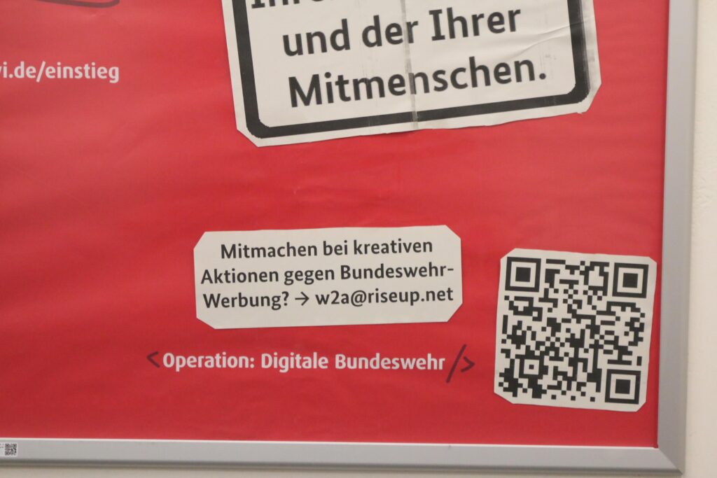 Falls Du mitmachen möchtest bei kreativen Aktionen gegen Militär-Werbung, trete bitte gerne per Mail mit uns in Kontakt: w2a@riseup.net