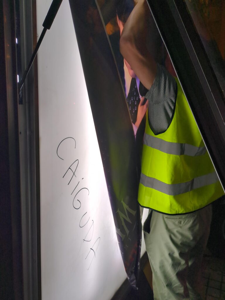 Wir machten uns also auf den Weg durch das nächtliche Barcelona. Das war sehr spannend, mit neuen Leuten sowas zu machen. Klappte auch alles ganz okay. Die Werbevitrinen lassen sich viel leichter öffnen als hier bei uns in Berlin. Die sind viel weniger schrottreif. Die Aktion wirkt auch: Ein paar Leute bleiben stehen und schauen sich die Papierflugzeuge in den Werbevitrinen an. Wir kommen rasch voran. Unsere Route ist recht schnell abgearbeitet. Polizeikontakt oder sonstige Probleme haben wir keine. Doch das ist leider nicht bei allen Teams so…