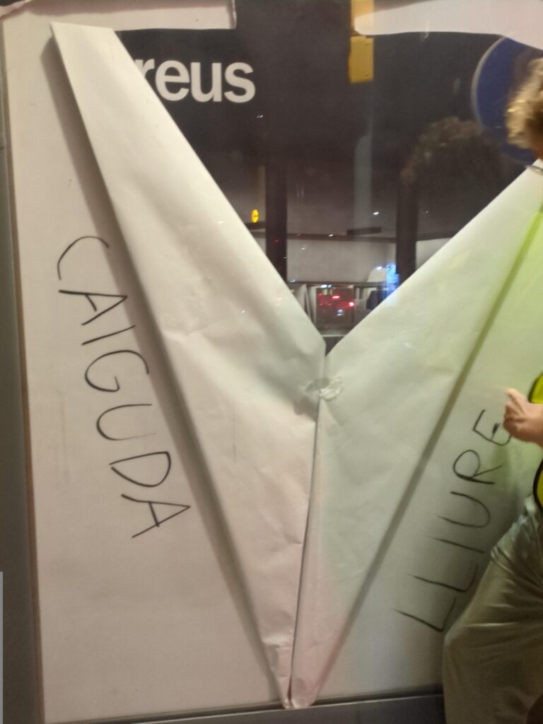 Um gegen den Flughafenausbau, Über-Tourismus und Mietenwahnsinn in Barcelona zu protestieren, hatten Adbuster*innen aus Barcelona sich eine spannende Adbusting-Aktions-Idee: Plakate in Werbevitrinen zu einem Papierflieger falten und auf die dadurch frei werdende Fläche „Caiguda Lliure“ oder „Free Fall“ kritzeln. Wir haben bei der Aktion mitgemacht. Sie lief leicht aus dem Ruder: Zwei Verhaftungen, drei Identitätsfeststellung und die Cops haben vermutlich alle Daten der Konferenzteilnehmerinnen abgegriffen. Die Verfahren sind mittlerweile eingestellt. Was wir daraus gelernt haben.